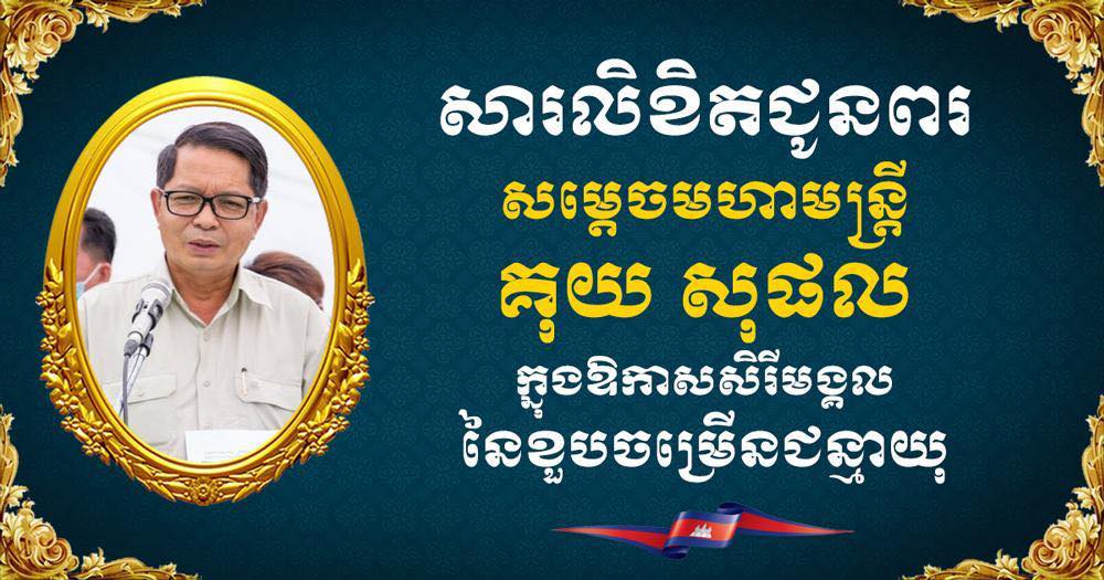 ក្នុងឱកាសដ៏វិសេសវិសាលប្រកបដោយសិរីមង្គលដ៏បវរ នៃពិធីចម្រើនជន្មាយុរបស់ សម្តេចមហាមន្ត្រី គុយ សុផល ឧត្តមប្រឹក្សាផ្ទាល់ព្រះមហាក្សត្រ និងជាឧបនាយករដ្ឋមន្ត្រី រដ្ឋមន្ត្រីក្រសួងព្រះបរមរាជវាំង នៃព្រះរាណាចក្រកម្ពុជា នៅថ្ងៃទី១៥ ខែតុលា ឆ្នាំ២០២៥ ឯកឧត្តម ឧត្តមសេនីយ៍ឯក រ័ត្ន ស្រ៊ាង មេបញ្ជាការរងកងរាជអាវុធហត្ថលើផ្ទៃប្រទេស និងជាមេបញ្ជាការកងរាជអាវុធហត្ថរាជធានីភ្នំពេញ សូមចូលរួមសម្ដែងនូវក្តីសោមនស្សក្រៃលែងប្រកបដោយភាពកក់ក្តៅ ជូនចំពោះ សម្តេចមហាមន្ត្រី។