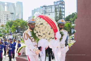 ទូលបង្គំយើងខ្ញុំជាកូនចៅ ចៅទួត ចៅលួត នៅតែចងចាំជានិច្ចរាល់ ស្នាព្រះហស្ថ ព្រះរាជបូជនីយកិច្ច និងគុណូបក្ការៈដ៏ធំធេង ខ្ពង់ខ្ពស់បំផុត នៃអង្គសម្តេចឪ សម្តេចតា សម្តេចតាទួត ដែល ទ្រង់បានលះបង់ព្រះកាយពល ព្រះបញ្ញាញាណ ដើម្បីឯករាជ្យជាតិ អធិបតេយ្យ និងបូរណភាពដែនដី។