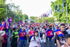 នារសៀល ថ្ងៃទី១៨ ខែធ្នូ ឆ្នាំ២០២៥ មហាកម្លាំងសាមគ្គីនៃប្រជាជាតិខ្មែរមកពីគ្រប់មជ្ឈដ្ឋាន គ្រប់និន្នាការនយោបាយ និងសាសនា បានមកជួបជុំគ្នាក្រោមស្មារតីខ្មែរតែមួយ ដើម្បីធ្វើព្យុហយាត្រា «ដើរដើម្បីសន្តិភាព» របស់មហាគ្រួសារខ្មែរ បានចាប់ផ្ដើមចេញដំណើរពីបរិវេណផ្សាររាត្រីមាត់ទន្លេ ឆ្ពោះទៅកាន់សួនច្បារវិមានឯករាជ្យ ក្នុងបរិយាកាសពោរពេញដោយក្ដីសង្ឃឹម ក្ដីជឿជាក់ និងស្មារតីសាមគ្គីភាពជាតិ។