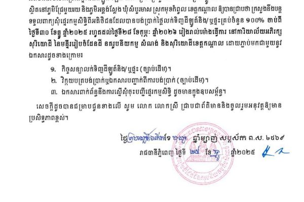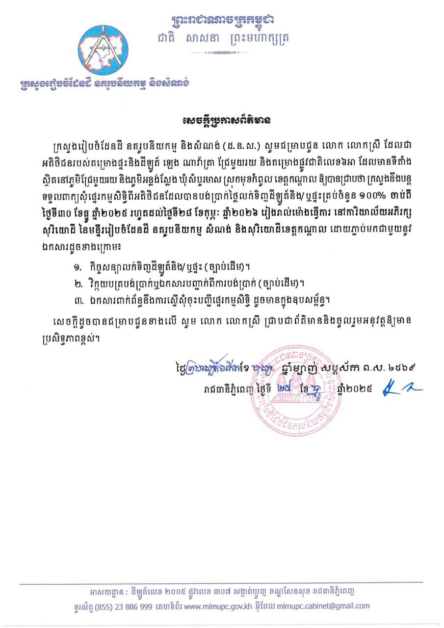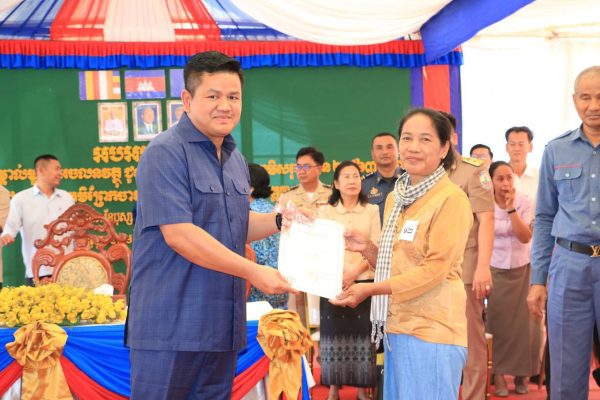ឯកឧត្តមមាន ច័ន្ទវ៉ាន់នី អនុរដ្ឋលេខាធិការក្រសួងរៀបចំដែនដី នគរូបនីយកម្ម និងសំណង់ និងឯកឧត្តម គួច ចំរើន អភិបាលនៃគណៈអភិបាលខេត្តកណ្តាល បានអញ្ជើញជាអធិបតី ក្នុងពិធីចែកវិញ្ញាបនបត្រសម្គាល់ម្ចាស់អចលនវត្ថុចំនួន ៥,៥៥៣ប័ណ្ណ ជូនបងប្អូនប្រជាពលរដ្ឋ នៅ ៥ភូមិ ដែលមានភូមិចុងមេស្រុក,ភូមិព្រែកលោក,ភូមិចុងព្រែក,ភូមិព្រែកតាមេម និងភូមិចាស់ សង្កាត់ព្រែកស្តី ក្រុងសំពៅពូន ខេត្តកណ្ដាល។