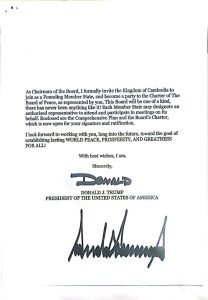 សារលិខិតរបស់ឯកឧត្តម ដូណាល់ ជេ ត្រាំ ប្រធានាធិបតីសហរដ្ឋអាមេរិក ជូនចំពោះសម្តេចមហាបវរធិបតី ហ៊ុន ម៉ាណែត នាយករដ្ឋមន្រ្តីនៃព្រះរាជាណាចក្រកម្ពុជា ដេីម្បីអញ្ជើញកម្ពុជាចូលរួមជារដ្ឋសមាជិកស្ថាបនិកនៃក្រុមប្រឹក្សាសន្តិភាព និងជាភាគីនៃធម្មនុញ្ញរបស់ក្រុមប្រឹក្សាសន្តិភាព។